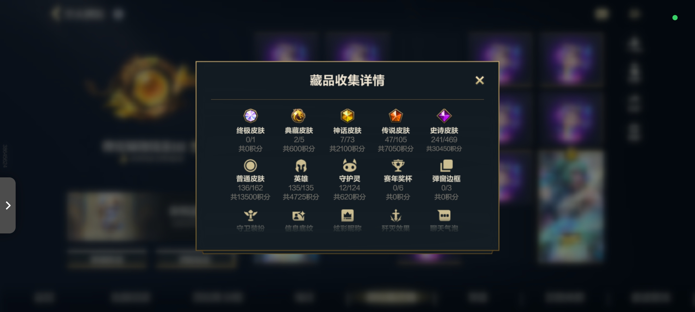 135英雄/596皮膚/4典藏/18神話/79傳說(shuō)/340史詩(shī)