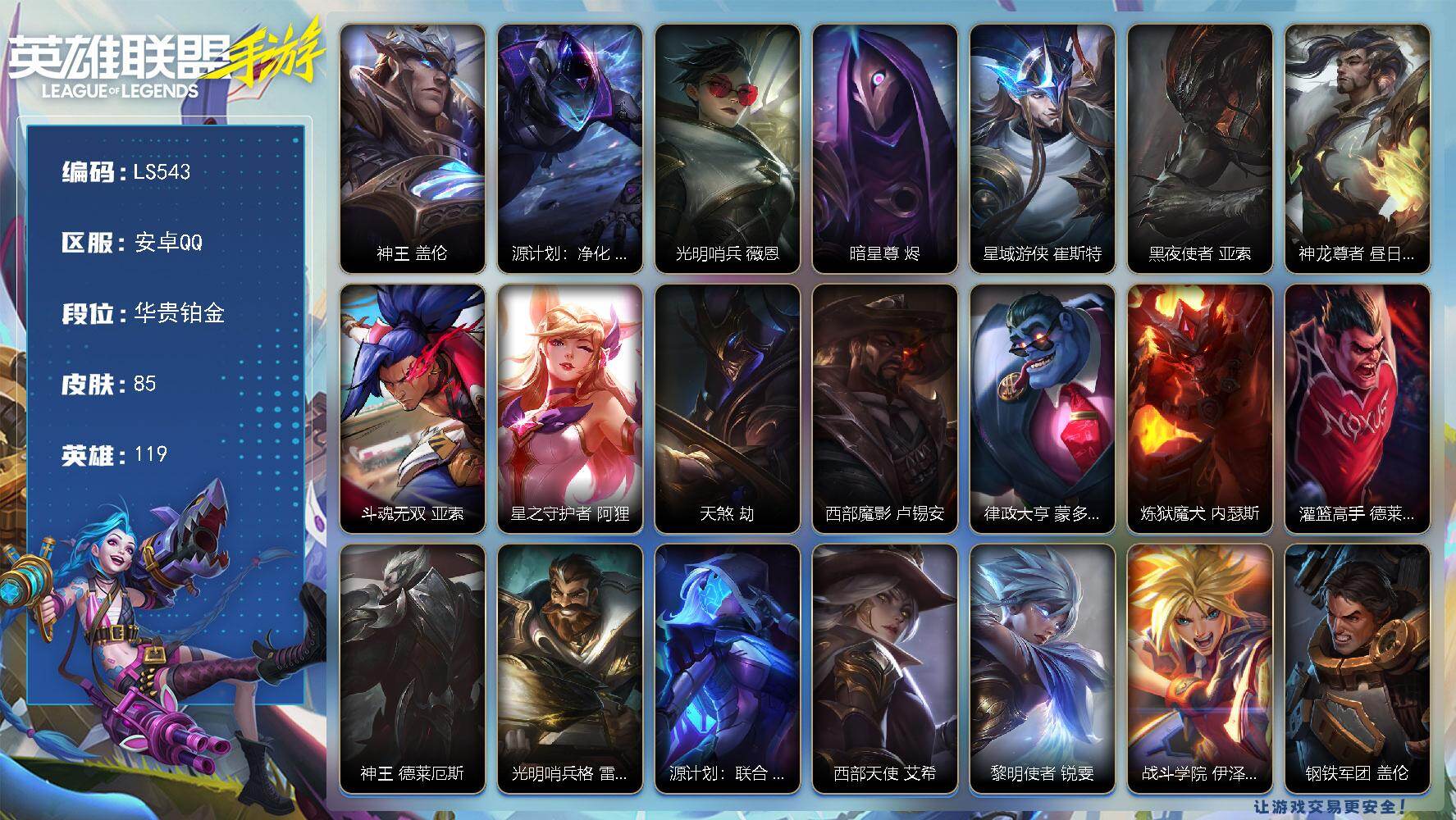 119英雄/85皮膚/20傳說(shuō)/華貴鉑金/神王 蓋倫/源計(jì)劃:凈化 薇恩/光明哨兵 薇恩